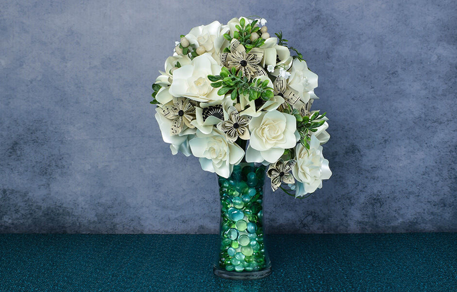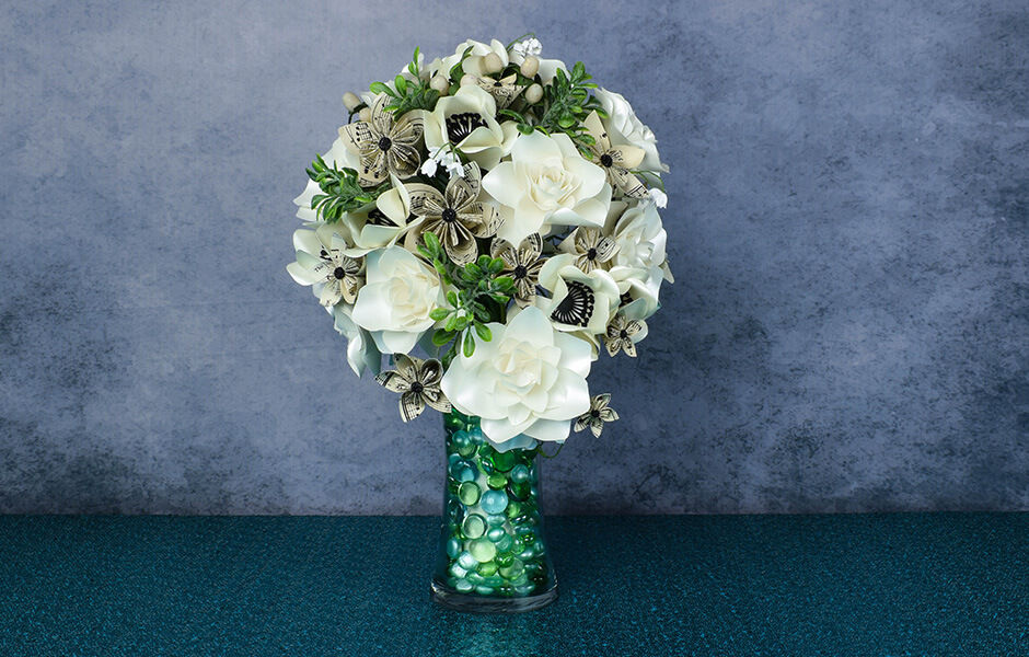 Gardenias, Anemones, Kusudamas, Lily of the Valley, Hypericum Berries, Faux Boxwood